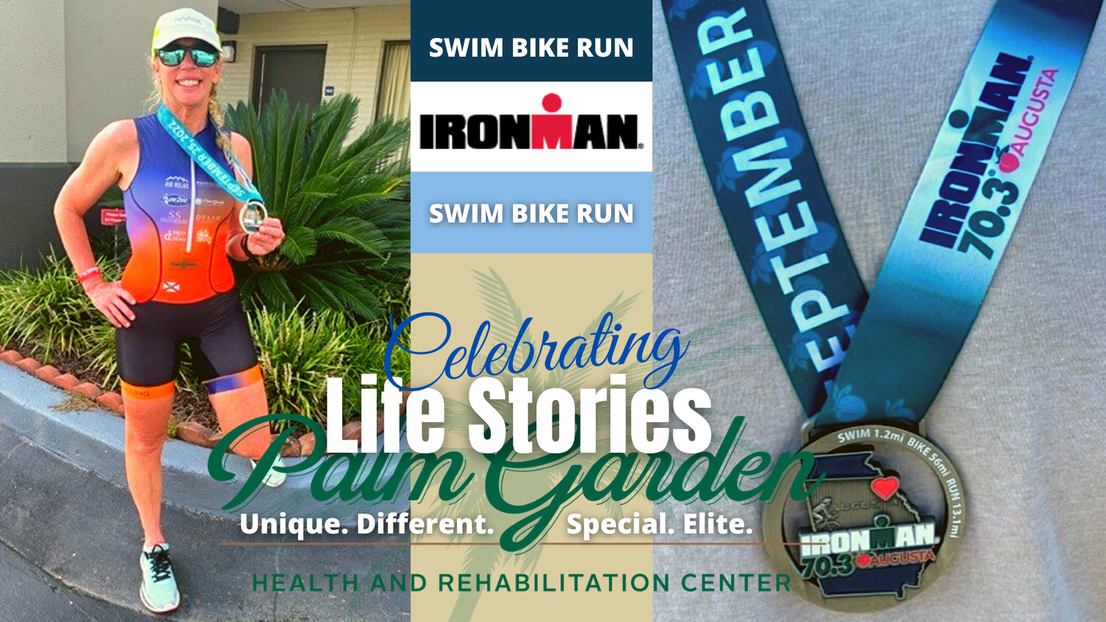 Join us in congratulating our very own IRONMAN Triathlon champion caregiver Diane Sweet, who set personal best records on all three legs of Augusta 70.3 IRONMAN. The dedication it takes to set all-time personal bests for each leg in the same race is inspirational! September 24, 2022, Diane swam 1.2 miles (in the Savannah River!) Biked 56 miles, and ran 13.1 miles. Oh yeah, did we mention she did them ALL IN A ROW! Diane’s passion for competition is only surpassed by her love for celebrating the life stories of our guests, residents, and family members. #WeArePalmGarden #PalmGardenStrong